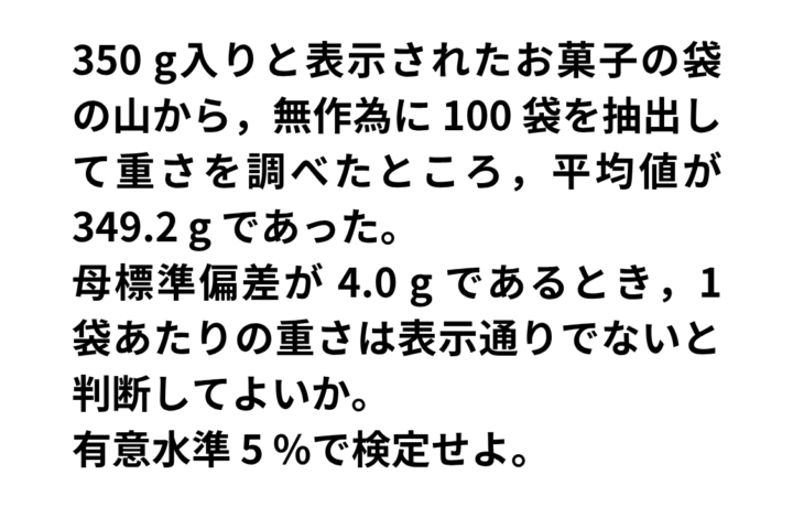 350 g入りと表示されたお菓子の袋の山から,無作為に 100 袋を抽出して重さを調べたところ,平均値が 349.2 g であった。母標準偏差が 4.0 g であるとき,1袋あたりの重さは表示通りでないと判断してよいか。有意水準 5 %で検定せよ。