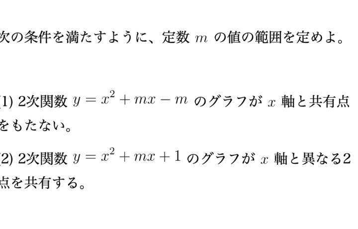 (1) 2次関数 $y=x^2+mx-m$ のグラフが $x$ 軸と共有点をもたない。 (2) 2次関数 $y=x^2+mx+1$ のグラフが $x$ 軸と異なる2点を共有する。