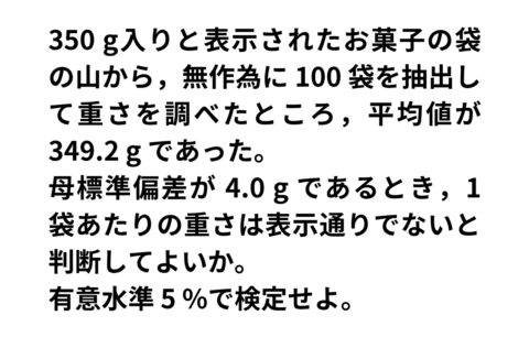 350 g入りと表示されたお菓子の袋の山から,無作為に 100 袋を抽出して重さを調べたところ,平均値が 349.2 g であった。母標準偏差が 4.0 g であるとき,1袋あたりの重さは表示通りでないと判断してよいか。有意水準 5 %で検定せよ。
